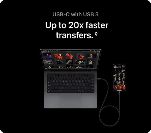 To exchange data on iPhone 15 Pro models up to 20 times faster, a USB 3 cable with a transfer speed of 10 Gbps is required.